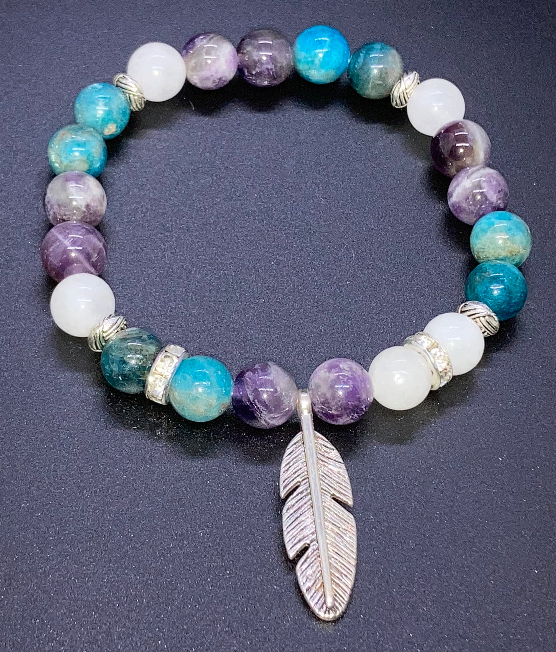 Amethyst, Apatite & White Agate feather charm bracelet 8mm